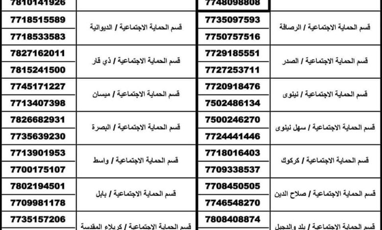 اعلنت هيأة الحماية الاجتماعية عن توفر دورات تدريبية للنساء المشمولات بالحماية الاجتماعية ستمكنهن من الحصول على قرض او فرصة عمل علما ان النساء المشاركات في الدورات سيتم منحهن مبالغ نقدية طيلة أيام الدورة فعلى الراغبات بالمشاركة في الدورات الاتصال على الأرقام التالية وكل حسب محافظتها.