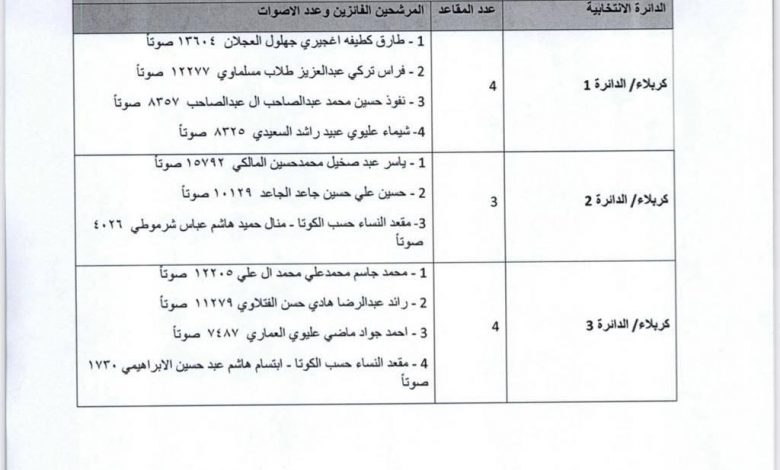 اسماء نواب كربلاء الفائزين في الانتخابات التشريعية