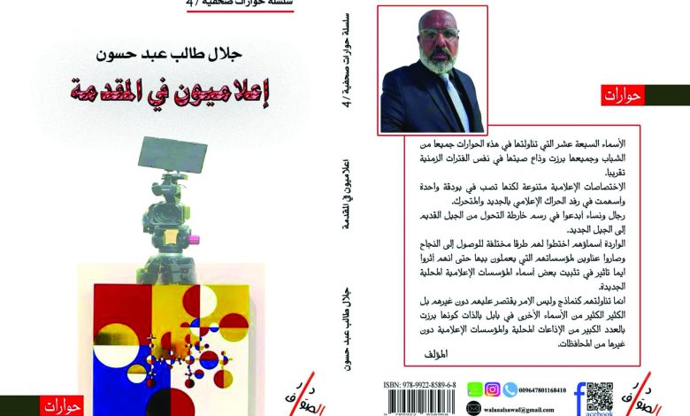 صدر حديثا عن دار الصواف للطباعة والنشر كتاب (إعلاميون في المقدمة) للصحافي والكاتب جلال طالب عبد حسون بواقع (١٤٠) صفحة من القطع الأوربي؛ تضمن الكاتب مجموعة حوارات صحفية مع (١٧) شخصية إعلامية من مختلف اختصاصات الإعلام (إذاعية وصحفية وتلفزيونية ومؤسسات إعلامية) من الأسماء الصحفية الشابة؛ وهم: منار العامري وعلي السلطاني وعماد محمد وجليل الغزي وعماد البكري واسرار فاضل وزيد النجار وطلال الهاشمي وعلاء التميمي وأمير حسين وحسين الخليل ووسام العقابي وزيد الأصيل وأزهار الكندي واحمد عبد الخفاجي ولؤي الرسام وسمارا الشمري، لما قدمت من منجز إعلامي مجتهد ومختلف حسبما ذكره المؤلف في مقدمة الكتاب.