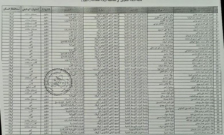 تعلـن محافظـة كـربلاء المقدسـة / الإدارة المحليـة عـن أسـماء المشمولين بـــــالتعيين مـن خريجـي المعاهـد (الـدبلوم ) الأوائــل والبـالغ عـددهم (64)