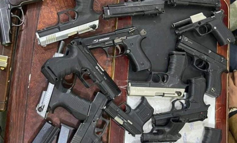 إذ عثرت بحوزته على ٢٠ مسدساً، و٧ بنادق مختلفة، و١٠٠٠ اطلاقة أعتدة مختلفة.