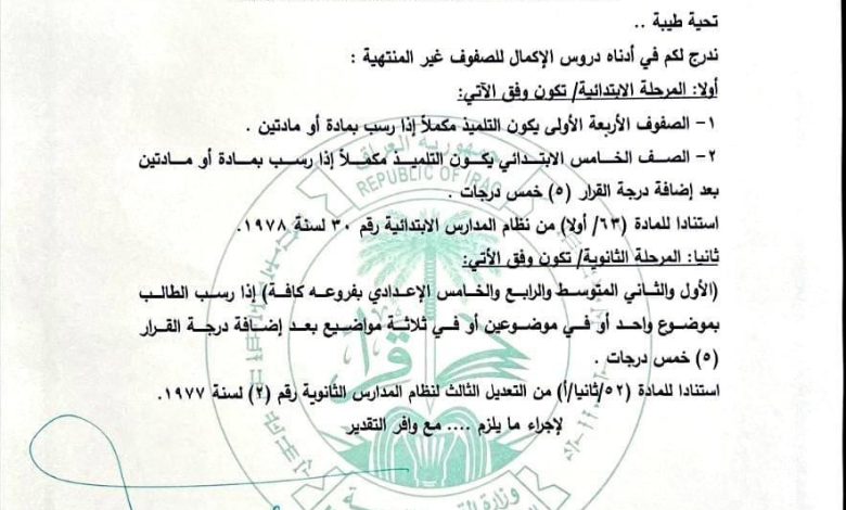 – الصف الخامس الابتدائي يكون التلميذ مكملاً إذا رسب بمادة أو مادتين بعد إضافة درجات القرار ال (5) .