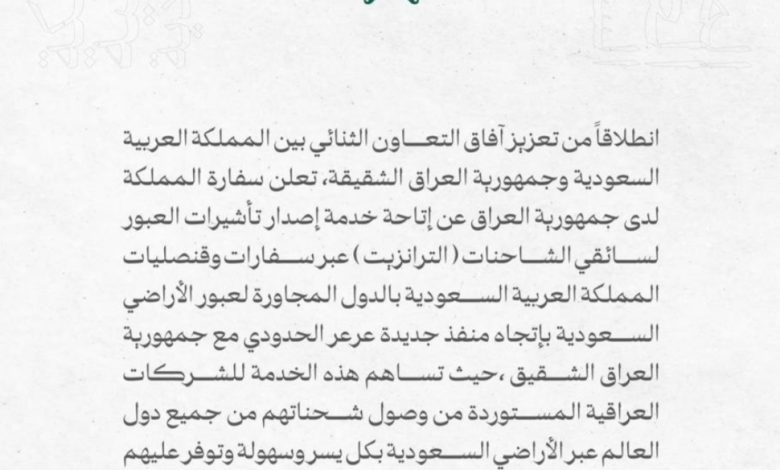 وأوضحت السفارة في بيان لاحدى الوكالات و تابعتة وكالة كان نيوز الاخبارية ، “انطلاقا من تعزيز آفاق التعاون الثنائي بين المملكة السعودية وجمهورية العراق، فإن السفارة السعودية تعلن إتاحة إصدار خدمة تأشيرات العبور لسائقي الشاحنات (الترانزيت) عبر سفارات وقنصليات المملكة العربية السعودية بالدول المجاورة لعبور الأراضي السعودية باتجاه منفذ جديدة عرعر الحدودي مع العراق”.