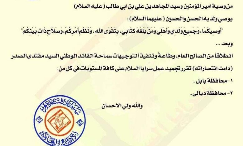 في بيان صادر من المعاونية الجهادية في سرايا السلام، والتي حصلت كان نيوز على نسخة منه، قرر السيد مقتدى الصدر بتجميد عمل السرايا في محافظتي ديالى وبابل، فيما لم يوضح الأساب التي دعت الى قرار التجميد.