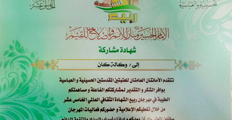 كرمت الامانتان العامتان للعتبتين المقدستين الحسينية والعباسية، وكالة أنباء كربلاء /كان نيوز بشهادة تقديرية وهدية رمزية، تثمينآ لجهودها الكبيرة ومشاركتها الفاعلة ومساهمتها الطيبة في تغطية فعاليات مهرجان ربيع الشهادة الثقافي الدولي بنسخته الخامسة عشر.