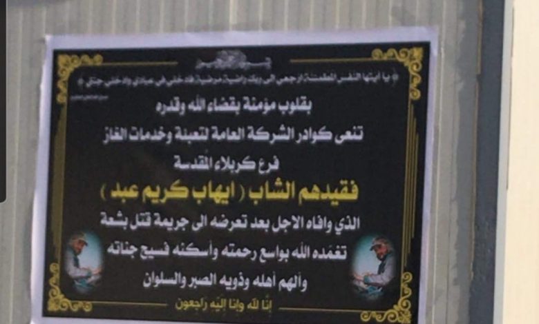 وذكر بيان للشركة العامة لتعبئة وخدمات الغاز في كربلاء تلقته وكالة انباء كربلاء (كان ينوز): ” ان المواطن ( إيهاب كريم عبد ) هو موظف في الشركة العامة لتعبئة وخدمات الغاز، وقد عثر على جثته بعد ان تم اختطافه منذ يوم الخميس الماضي وقد اصيب بـ(3) اطلاقات ناية في منطقة الصدر”.
