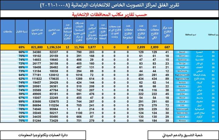 أعلنت المفوضية العليا المستقلة للانتخابات في العراق، في بيان أن نسبة المشاركة في التصويت الخاص الذي شارك فيه قوى أمن البلاد بالإضافة إلى النازحين في المخيمات والسجناء، 69% في عموم البلاد.