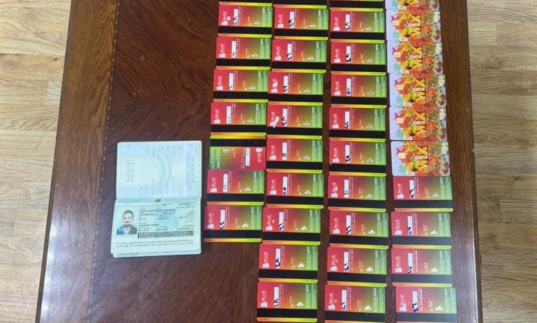 بالاضافه الى احالة مسافر بموجب محضر ضبط وفقاً للماده (٢٢٩) من قانون الكمارك لعدم التصريح عن ما يحمله وبعد تفتيش الحقيبة بشكل دقيق تم العثور على ( ٦٥ ) بطاقة ماستر وڤيزا متنوعة مخبئة داخل احذية في حقيبته التي كان يروم شحنها .