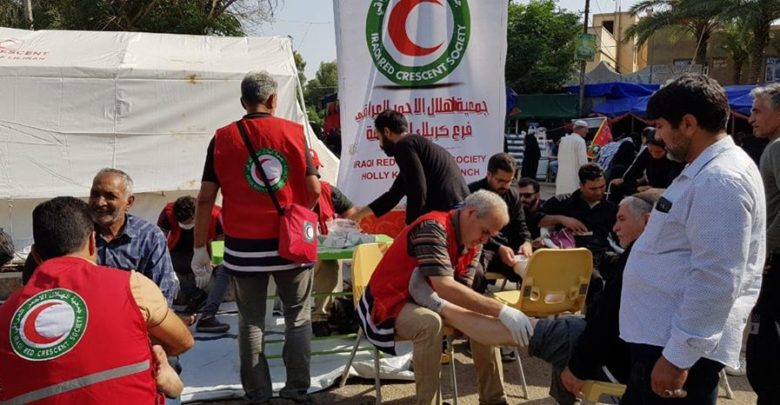 أعلن الهلال الاحمر العراقي عن مشاركة سبعة الاف متطوع لتقديم خدمات انسانية للزائرين على مختلف الطرق المؤدية الى مدينة كربلاء المقدسة ،وذكر رئيس فرع جمعية الهلال الاحمر في كربلاء:” ان (150) فريق اغاثة متواجدون على جميع طرق الزائرين، يتولون مهمة معالجة المصابين بالامراض والجروح، فضلا عن نشر التوعية الصحية، وتقديم خدمات طبية اخرى”.