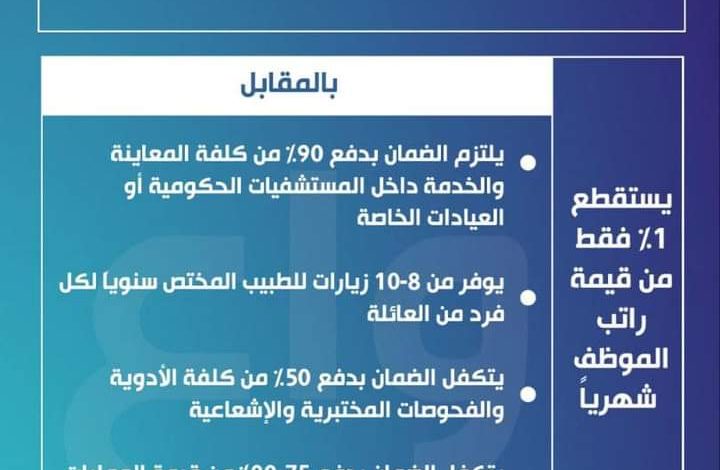 وعن أهم الخدمات المقدمة أوضح وزير الصحة، أن” الموظف سيدفع 1% من راتبه للضمان الصحي وبالمقابل ستقدم له ولعائلته الخدمات الصحية بموجب الضمان وإن كان والده ووالدته على قيد الحياة وليسوا من الموظفين أو المتقاعدين فيشملون معه بالقائمة وإذا كانت هناك أخت هو يرعاها غير موظفة ستكون أيضا مشمولة بمعنى أن جميع أفراد العائلة مهما كان عددهم سيتم شمولهم ضمن نسبة 1% المستقطعة من الراتب”.