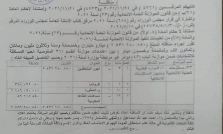 بحسب وثيقة حصلت عليها كان نيوز، وزارة المالية تقرر صرف رواتب المتعاقدين العاملين في المفوضية العليا المستقلة للانتخابات.