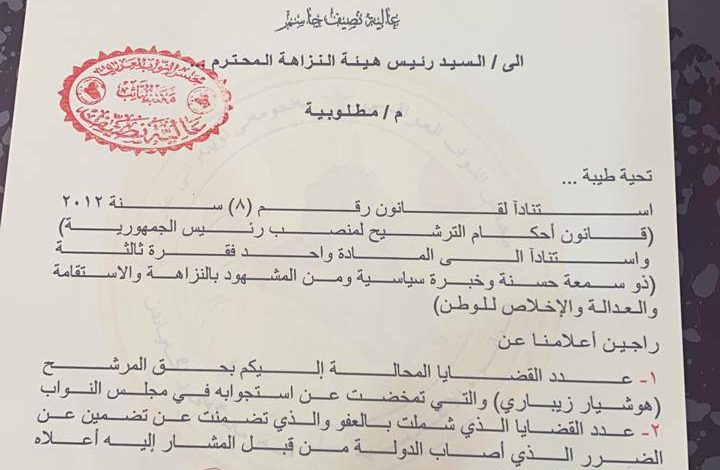 وجاء في الكتاب الذي حصلت كان نيوز على نسخة منه، ان نصيف طالبت بالكشف عن ملفات الفساد التي ادين بها زيباري في جلسة مجلس النواب الأسبق.