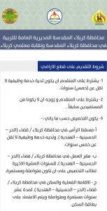وقال مدير عام التربية في المحافظة عباس عودة السلطاني، انه ” وفق التوقيت الذي حدّد قبل يومين بعد استحصال موافقة السيد محافظ كربلاء المقدسة المهندس نصيف جاسم الخطابي، نعلن عن إطلاق استمارة التقديم الإلكتروني الخاص بقطع الأراضي السكنية الخاصة بالسادة والسيدات ضمن الكوادر التربوية والإدارية والوظائف الخدمية وللمرحلة الثانية “.