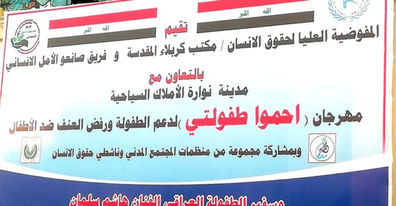 نظم مكتب المفوضية العليا لحقوق الانسان في كربلاء المقدسة وبالتعاون مع فريق صانعوا الامل الانساني احدى منظمات المجتمع المدني العاملة في مجال حقوق الانسان وبمشاركة مجموعة من منظمات المجتمع المدني وناشطي حقوق الانسان، مهرجانا لدعم الطفوله ورفض العنف ضد الاطفال تحت شعار (إحموا طفولتي) وذلك على مسرح مدينة نوارة الاملاك السياحية بالمحافظة، وبحضور النائب الاول للمحافظ جاسم الفتلاوي وسفير الطفولة العراقي الفنان هاشم سلمان وعددا من مسؤولي المؤسسات الحكومية بالمحافظة.