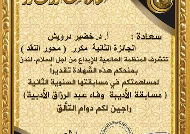 درويش يحصد الجائزة الثانية في مسابقة المنظمة العالمية للإبداع من أجل السلام