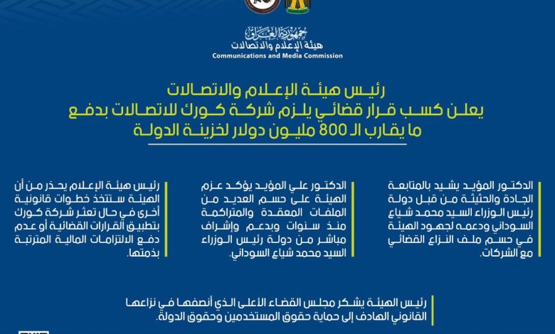 أعلن رئيس هيئة الإعلام والاتصالات الدكتور علي المؤيد في بيان حصلت عليه وكالة كان نيوز عن كسب قرار قضائي لصالح الهيئة بات وملزم لشركة كورك تيليكوم للاتصالات بدفع 800 مليون دولار لخزينة الدولة العراقية.