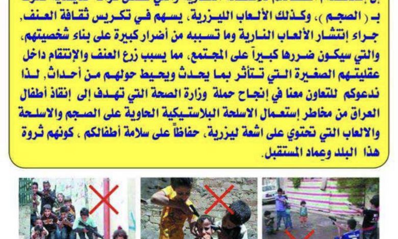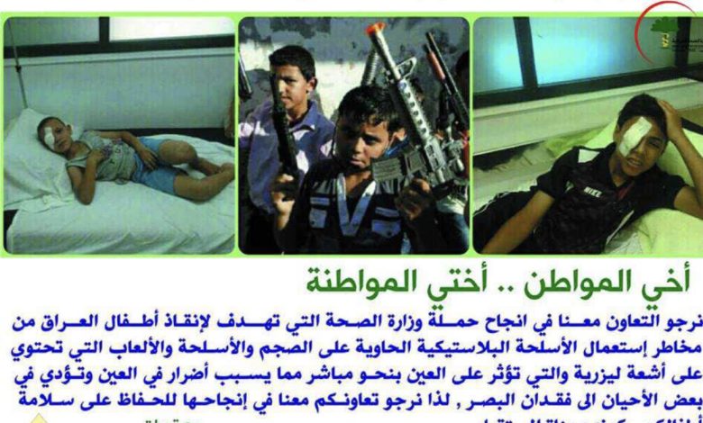 دعت دائرة صحة كربلاء المُقدسة  ، المُواطنين للإحتياط من إستخدام أطفالهم للألعاب النارية ذات الإطلاقات البلاستيكية ( الصجم ) والمُفرقعات والمصابيح الليزرية خلال أيام عيد الأضحى المُبارك ، فيما بيَنت إنها ” تُؤثر على شبكية العين وقد تتسبب بالعمى في الكثير من الأحيان ، وكذلك الحروق والتشوهات ” ، إضافة إلى ” تكريسِ ثقافةِ العنف وما تُسببه من أضرارٍ في بناءِ شخصيتهم ” . وقال مُعاون المدير العام للدائرة ، الدكتور ماجد الميالي ، في بيان حصلت عليه وكالة كان نيوز  إن ” دائرة الصحة إعتادت على إطلاق حملة توعوية إرشادية دعماً للحملة التي أطلقتها وزارة الصحة منذ عدةِ سنوات لإنقاذ أطفال العراق من مخاطر إستعمال الألعاب النارية والأسلحة البلاستيكية الحاوية على ( الصجم ) والمُفرقعات “. وأضاف الميالي ، ان “الحملة تحثُ أيضاً على الإبتعاد عن الألعاب والأسلحة والألعاب التي تحتوي على أشعة ليزرية تؤثر على العين بنحو مُباشر مما يُسَبب لها الأضرار، وفي بعض الأحيان تؤدي إلى فقدان البصر” ، لافتاً الى إنه “وفقاً لإحصائية أعدَتها وزارة الصحة ، فإن السنوات السابقة شهدت إرتفاع نسب الإصابة بـ ( الصجم ) ، جراء إستخدام الأسلحة البلاستيكية ، والتي وصلت في أحد الأعياد إلى ( 250 ) حالة”، مُبيناً إن “إستخدام الأطفال للأسلحة البلاستيكية والتي تطلق كُراتٍ حديديةٍ وكذلك الليزرية ، يُسهم في تكريس ثقافة العنف وما تُسببه من أضرارٍ في بناء شخصيتهم”. وفي حين ناشد الميالي ، الأهالي إلى” ضرورة منع أطفالهم من شراء تلك الألعاب التي تحرض على العنف وتُنمي روح العداوة والكراهية لديهم ، كما تُصيبهم بعاهات دائمية تصل إلى العمى ، وهو ما قد يساهم في قتلِ قُدراتهم الجسمانية والعقلية “، فإنه ” دعا الجهات الحكومية ذات العلاقة والأجهزة الرقابية بضرورة إتخاذ الإجراءات القانونية الرادعة التي من شأنها أن تحد من إنتشار هذه الألعاب الخطرة وتداولها في الأسواق المحلية”، بمُوازاة تأكيدهُ على “أهمية دور وسائل الإعلام المختلفة في تنظيم الحملات التثقيفية والإرشادية ، إلى جانب ” قيام منظمات المجتمع المدني بمُمارسة دورها الايجابي في هذا الجانب بهدف إشاعة روح التعاون والتسامح وخلقِ جيلٍ سليمٍ ومُعافى”.