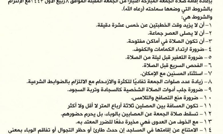 أعلن المكتب الخاص للسيد مقتدى الصدر في بيان اليوم الاربعاء الثاني عشر من تشرين الاول، وحصلت كان نيوز على نسخة منه، عن عودة اقامة صلاة الجمعة ابتداءًا من الجمعة المقبلة، كما وحدد شروط إقامتها من قبل المصلين، تتمثل بأن لا يزيد وقت الخطبتين عن 15 دقيقة، وأن لا يصلى العصر جماعة، وأن تكون الصلاة في أماكن مفتوحة، والبعد بين المصلين لا يق ولا يزيد عن ثلاث ارباع المتر، كما حرّم البيان المشاركة في صلاة الحمعة على المصابين، وأسقطها عن المسنين.