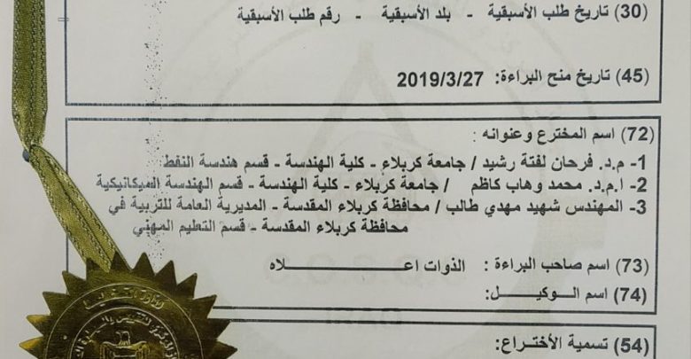 فريق بحثي في جامعة كربلاء يحصل على براءة أختراع