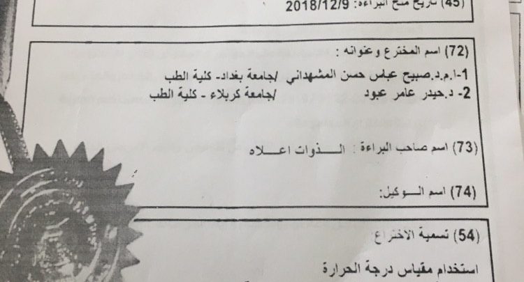 حصل فريق بحثي من جامعة كربلاء وجامعة بغداد على براءة أختراع , عن أكتشاف طريقة جديدة لتقييم وتشخيص الامراض الجلدية ,باستخدام جهاز قياس درجة الحرارة النقطي بالاشعة الحمراء .