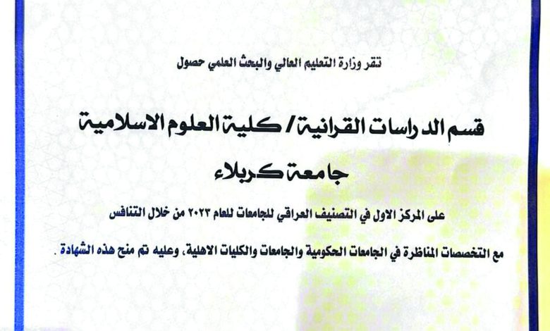 حصل قسم علوم القرآن والتربية الاسلامية في كلية العلوم الإسلامية بجامعة كربلاء على شهادة تميز منحت من قبل وزارة التعليم العالي والبحث العلمي؛ وذلك لحصوله على المركز الأول في التصنيف العراقي للجامعات عام ٢٠٢٣، في التخصصات المناظرة بالجامعات الحكومية والاهلية. وتعطي شهادة التميز جانب من التحفيز والتنافس في الاداء المؤسسي والبرامجي على صعيد الكليات والجامعات الحكومية والاهلية.