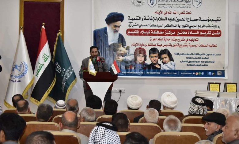 أقامت مؤسسة مصباح الحسين (ع) للإغاثة والتنمية في كربلاء المقدّسة حفلاً تكريمياً للسادة مخاتير مركز المحافظة تثميناً لتعاونهم في إطلاق مشروع ميثاق حماية أيتام العراق ولمطالبة السلطات الرسمية بتشريع قانون وتأسيس هيأة مستقلة لرعاية الأيتام تحت شعار ( الله الله في الأيتام )، وذلك بحسب المقيمين على الحفل الذي إستضافته المفوضية العليا لحقوق الإنسان في المحافظة بحضور السادة مخاتير مركز المدينة وعدد من رجال الدين والفضيلة وممثّلي المؤسسات الحكومية .