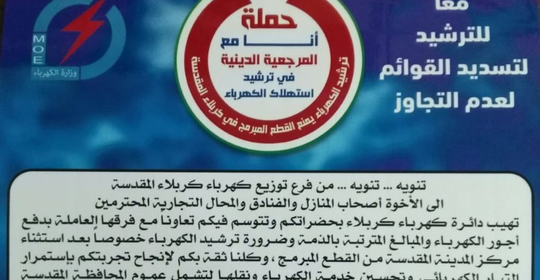 يطلق فرع توزيع كهرباء كربلاء المقدسة يوم الاحد المقبل 12/5/2019 حملة جباية أجور أستهلاك الكهرباء وترشيدها وأزالة التجاوز عن الشبكة الكهربائية وفي كافة القطاعات لتشمل عموم محافظة كربلاء المقدسة.