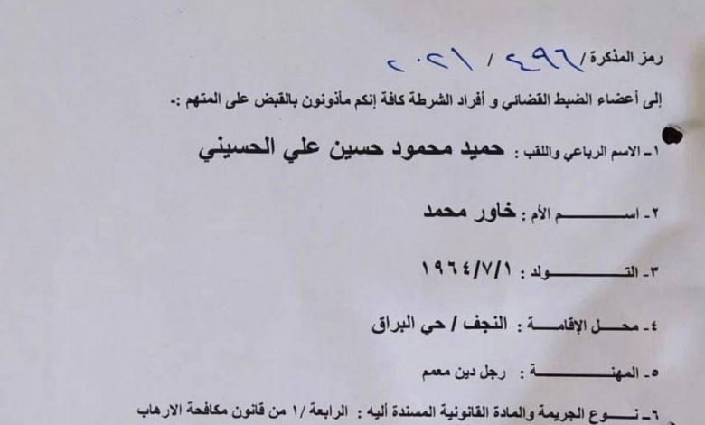 وبحسب الوثيقة الصادرة في الثالث من تشرين الثاني من العام الجاري، فإن الحسيني اصبح مطلوباً للقضاء العراقي.