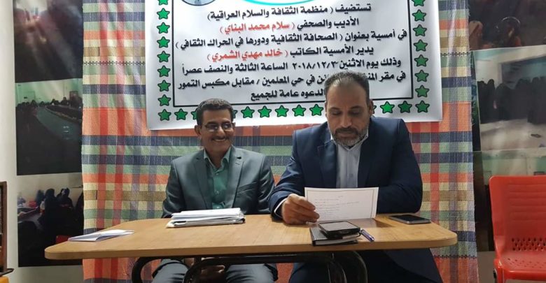 بدعوةمن منظمة الثقافة والسلام العراقية قدم نائب رئيس اتحاد ادباء وكتاب كربلاء.سلام البناي،محاضرة عن (الصحافة الثقافية ودورها في الحراك الثقافي)،عبر أمسية أدارها بكل محبة ونجاح الكاتب خالد مهدي الشمري . وتحدث البناي في المحاضرة عن الثقافة بوصفها شاملة لكل عناصر المعرفة والفكر والأخلاقيات، والآداب والفنون، وكل صنوف الإبداع. كما تطرقَ الى الصفحات الثقافية في الصحف اليومية والأسبوعية كونها تشكل رافدا مهما من روافد إشاعة الثقافة الجماهيرية ولها دور في نشر الوعي الثقافي والأدبي والفكري في المجتمع . مشيرا في محاضرته أيضا على تأثير بعض تلك الصفحات الثقافية، وعلى دورها الإيجابي في تطوير المجتمع وتحديثه والوظائف المهمة التي تؤديها تلك الصحف، في توعية الفرد ، وتشكيل الآراء لدى المتلقي عبر متابعته اليومية لمضامينها.