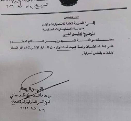 وثيقة مسرّبة.. اعفاء الضباط من التدقيق الأمني لأغراض السفر