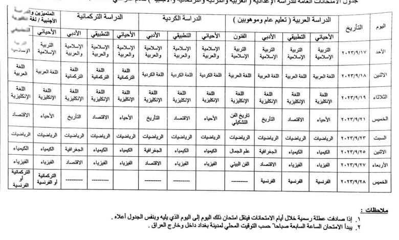 وزارة التربية :الموافق ٢٠٢٣/٩/١٧ موعداً لبدء الامتحانات العامة الدور الثاني للصف السادس الاعدادي للفروع كافة ( الاحيائي والتطبيقي والادبي )