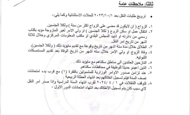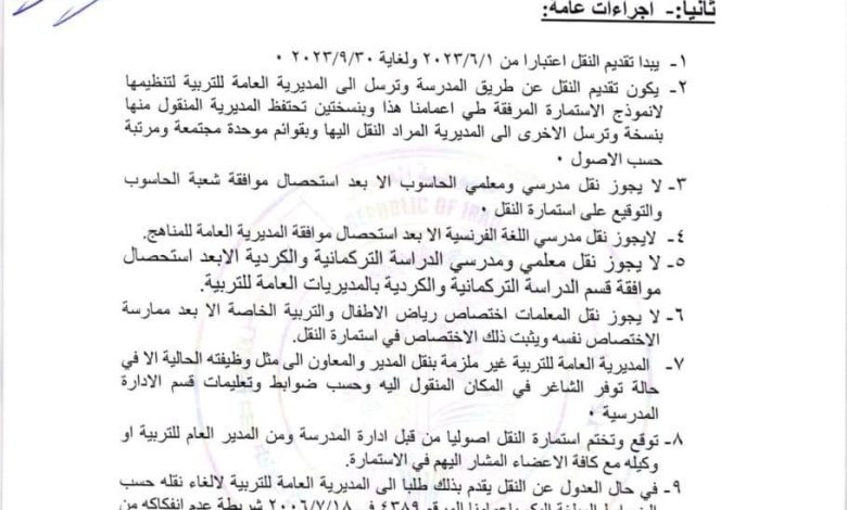 مضيفاً بعدم جواز نقل مدرسي ومعلمي مادة الحاسوب الا بعد استحصال موافقة شعبة الحاسوب ، وكذلك عدم نقل معلمي ومدرسي اللغة الفرنسية الا بعد استحصال موافقة المديرية العامة للمناهج ، وأيضاً عدم نقل معلمي ومدرسي الدراسة التركمانية والكردية الا بعد استحصال موافقة قسم الدراسة التركمانية والكردية بالمديريات العامة للتربية ، علاوة على ذلك عدم نقل المعلمات اختصاص رياض الأطفال والتربية الخاصة الا بعد ممارسة الاختصاص نفسه ويثبت ذلك الاختصاص في استمارة النقل.