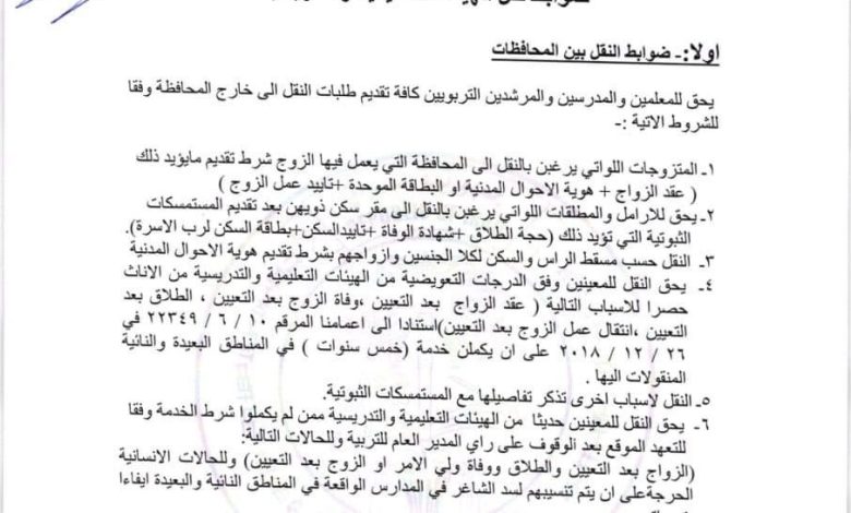 *المتزوجات اللواتي يرغبن بالنقل الى المحافظة التي يعمل فيها الزوج شرط تقديم ما يؤيد ذلك ، والأرامل والمطلقات اللواتي يرغبن بالنقل الى مقر سكن ذويهن بعد تقديم المستمسكات الثبوتية