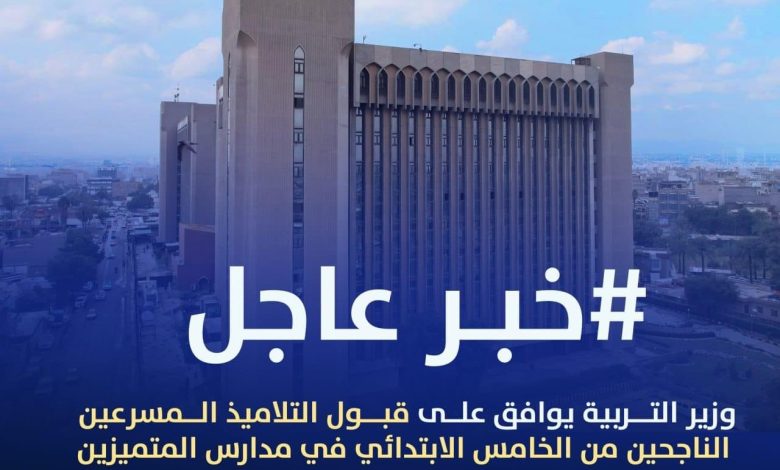 وافق وزير التربية الدكتور إبراهيم نامس الجبوري على قبول التلاميذ الذين اجتازوا اختبارات التسريع والامتحانات الوزارية للمرحلة الابتدائية بنجاح في مدارس المتميزين .