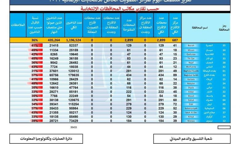 بيّنت احصائية صادرة عن دائرة العمليات وتكنولوجيا المعلومات عن المكاتب الانتخابية في المحافظات، بأن نسبة المشاركة في التصويت الخاص في الانتخابات التشريعية في العراق اليوم الجمعة ٨ تشرين الأول ولغاية الساعة الثانية عشر ظهراً هي ٣٦%.